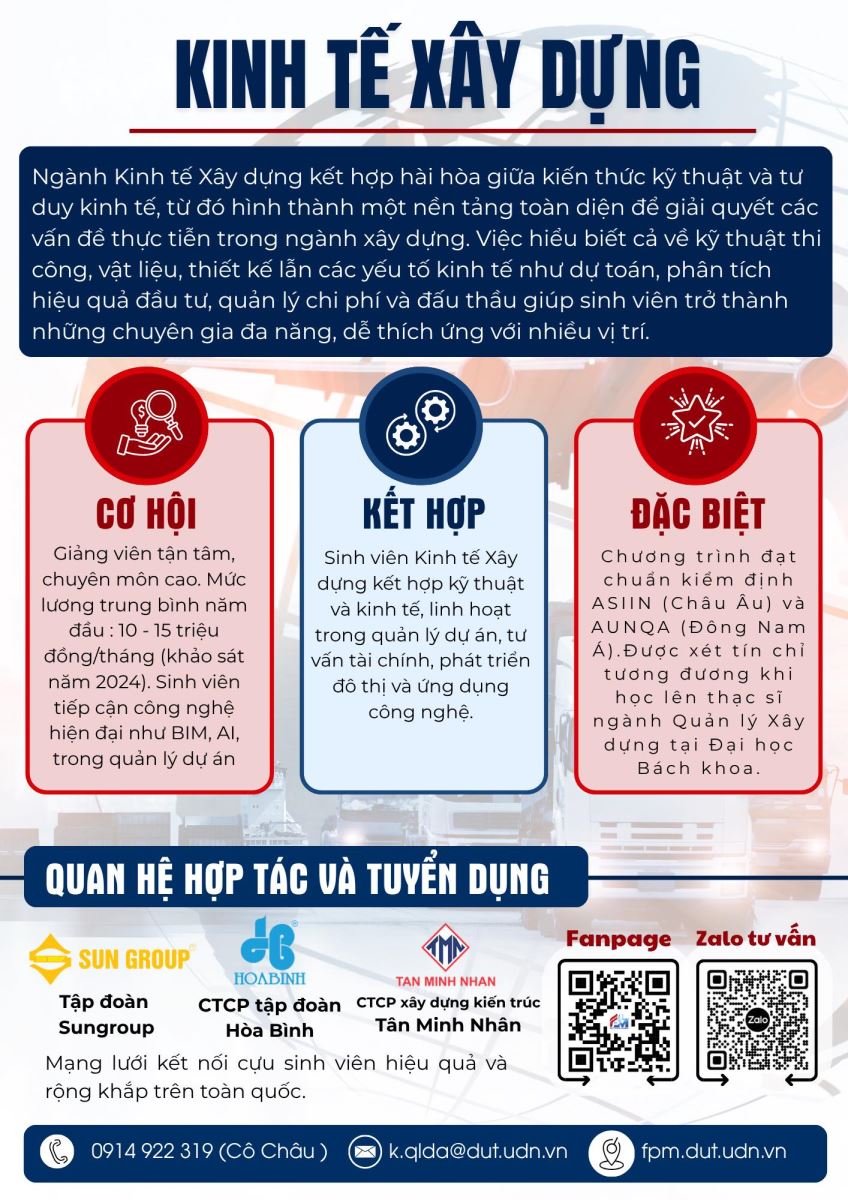 Ngành Kinh tế Xây dựng kết hợp hài hòa giữa kiến thức kỹ thuật và tư duy kinh tế, từ đó hình thành một nền tảng toàn diện để giải quyết các vấn đề thực tiễn trong ngành xây dựng. Việc hiểu biết cả về kỹ thuật thi công, vật liệu, thiết kế lẫn các yếu tố kinh tế như dự toán, phân tích hiệu quả đầu tư, quản lý chi phí và đấu thầu giúp sinh viên trở thành những chuyên gia đa năng, dễ thích ứng với nhiều vị trí.