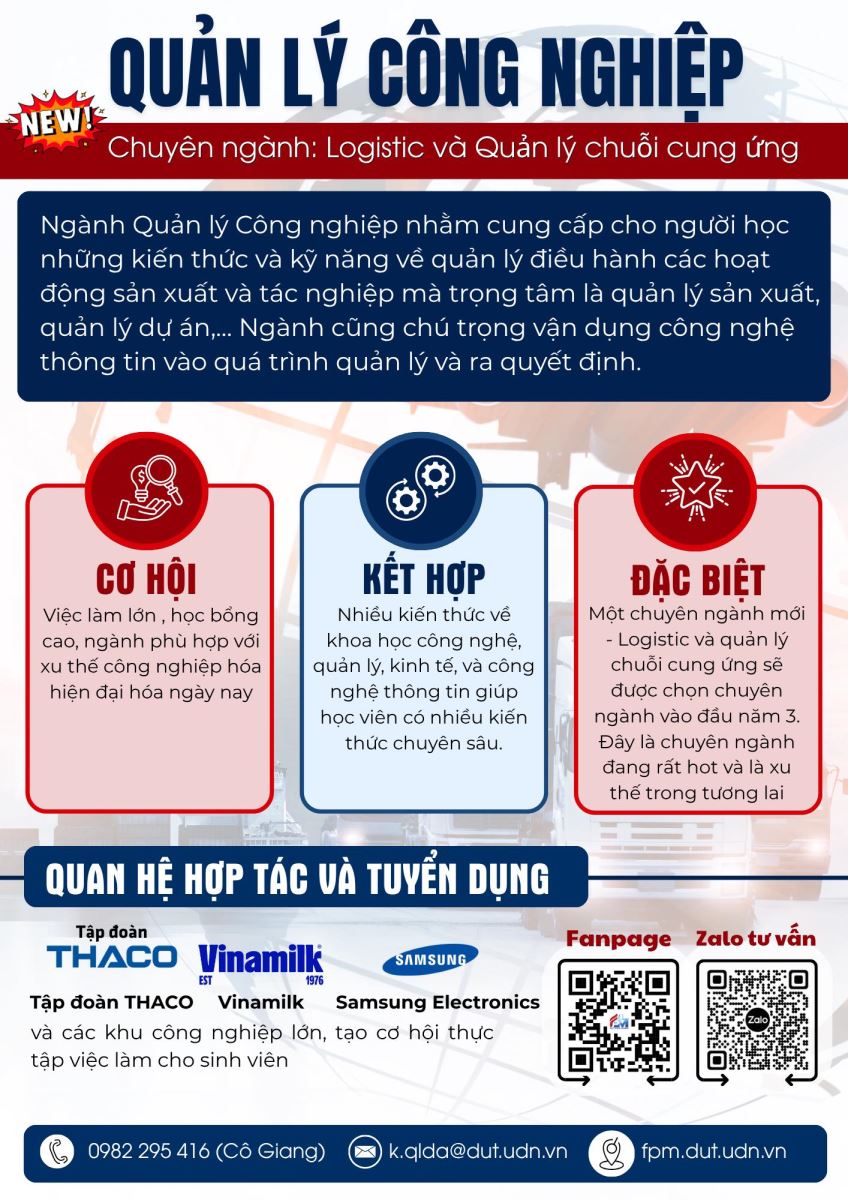 Đặc biệt Ngành Quản lý Công nghiệp đã mở thêm một chuyên ngành mới - 𝑳𝒐𝒈𝒊𝒔𝒕𝒊𝒄𝒔 𝒗𝒂̀ 𝑸𝒖𝒂̉𝒏 𝒍𝒚́ 𝒄𝒉𝒖𝒐̂̃𝒊 𝒄𝒖𝒏𝒈 𝒖̛́𝒏𝒈, sinh viên sẽ được chọn chuyên ngành vào đầu năm .Đây là một chuyên ngành đang rất cần cho nhu cầu phát triển theo định hướng của Thành phố Đà Nẵng và Việt Nam.